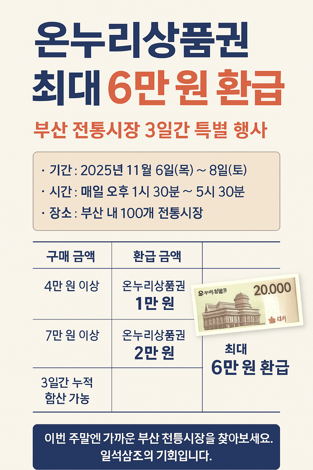 부산 전통시장 100곳에서 소비자에게 최대 6만 원 상당의 온누리상품권을 환급해주는 특별한 이벤트를 엽니다!